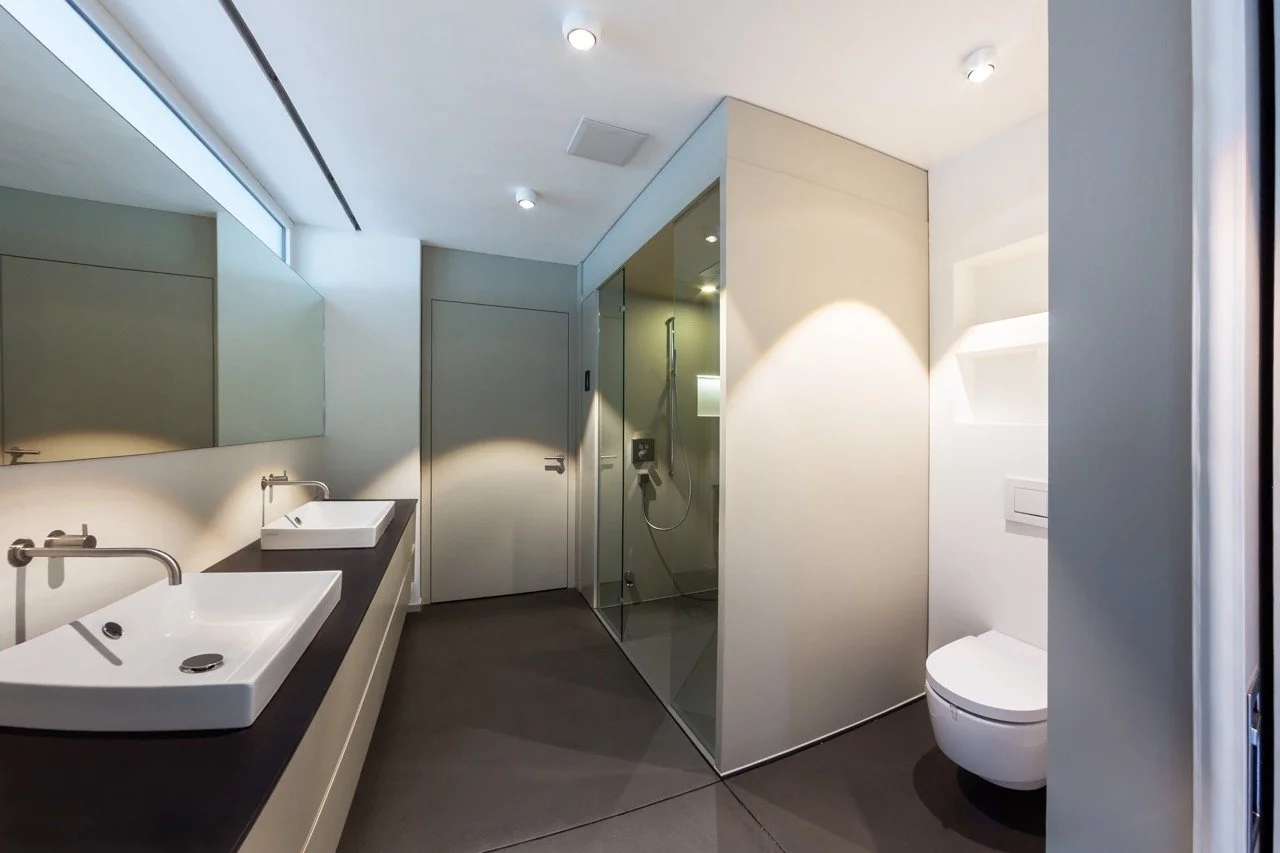 Das Neubauprojekt umfasste ein modernes Einfamilienhaus in Massivbauweise mit drei Geschossen in Hanglage. Die Architektur besticht durch klare Linien und eine zeitgemässe Gestaltung, die sich harmonisch in die Umgebung integriert. Das Haus wurde mit einem hohen Ausbaustandard umgesetzt, wobei besondere Anforderungen an die Oberflächenqualität und Geometrie gestellt wurden. Ein Flachdach mit wertvoll begrünter Oberfläche sorgt für eine nachhaltige Nutzung der Dachfläche. In den Obergeschossen befinden sich Schlaf- und Wohnzimmer, eine offene Küche sowie ein Bürobereich, ergänzt durch einen Toiletten- und Nasszellenbereich mit Dampfdusche.
